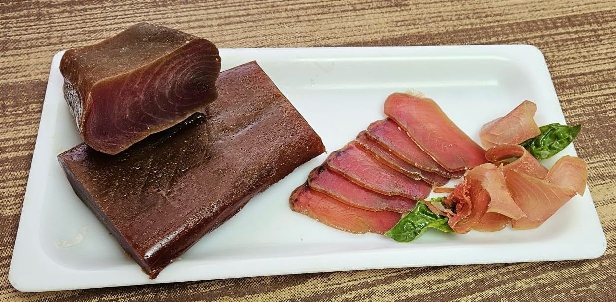 La mojama es elaborada a partir de atún salado y curado al sol. Se presenta en lonchas finas con un sabor intenso, salado y ligeramente ahumado.